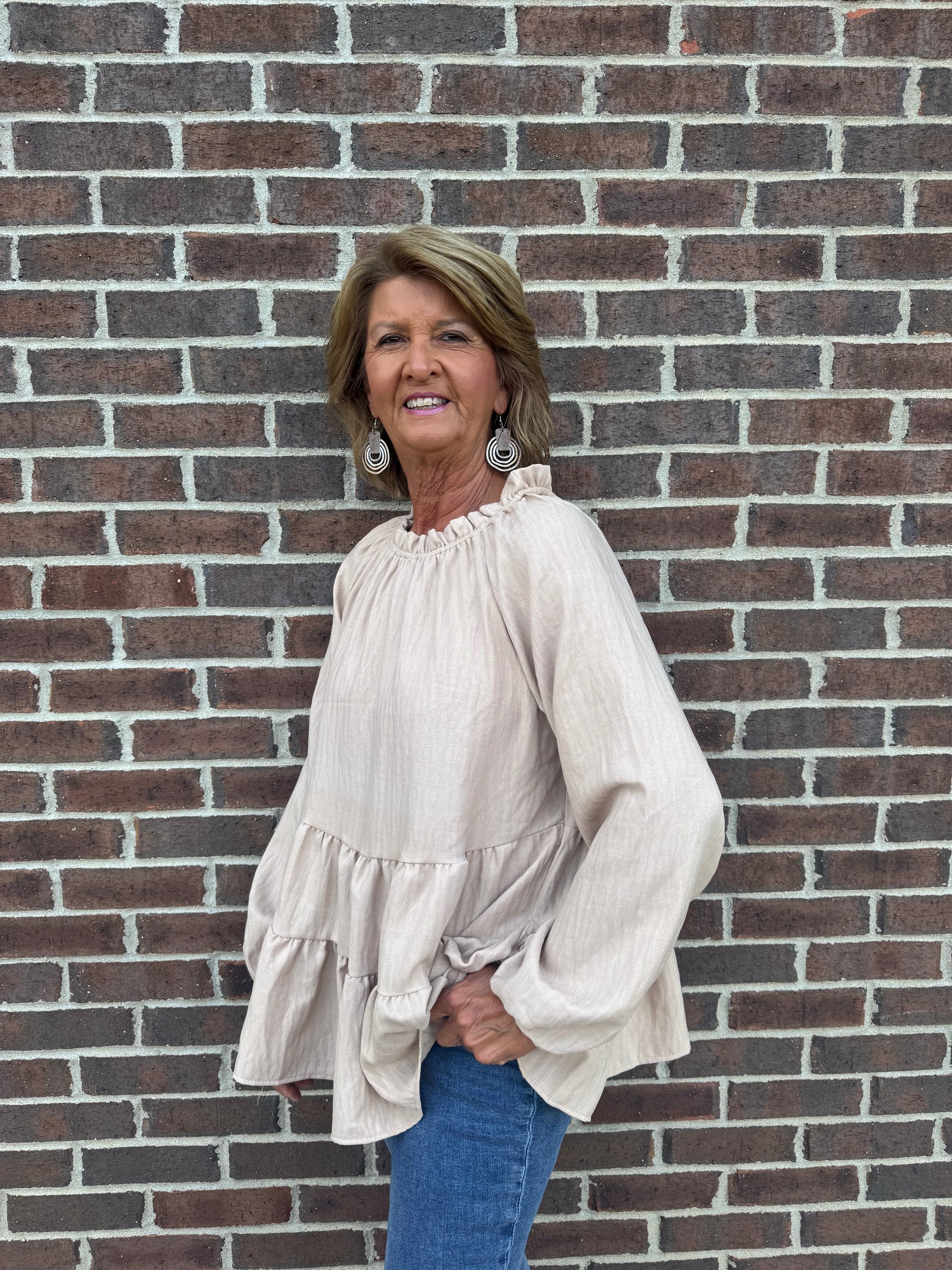 Carole Christian Long Sleeve Tiered Top with Ruffle Neckline - Khaki