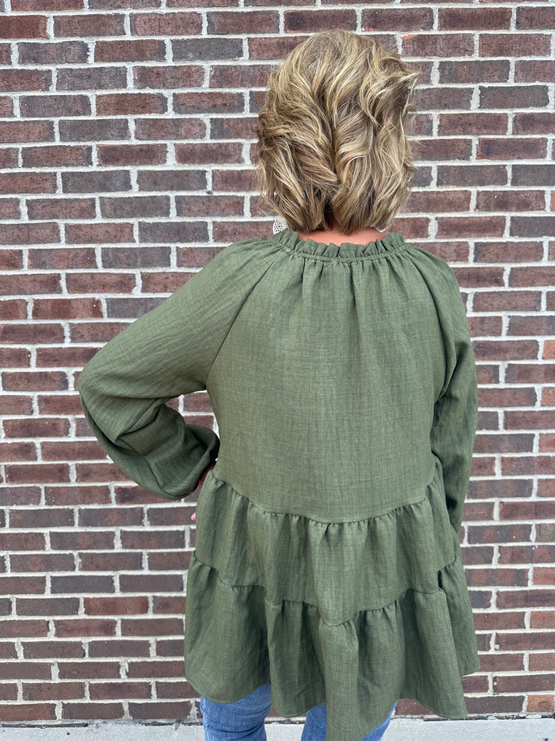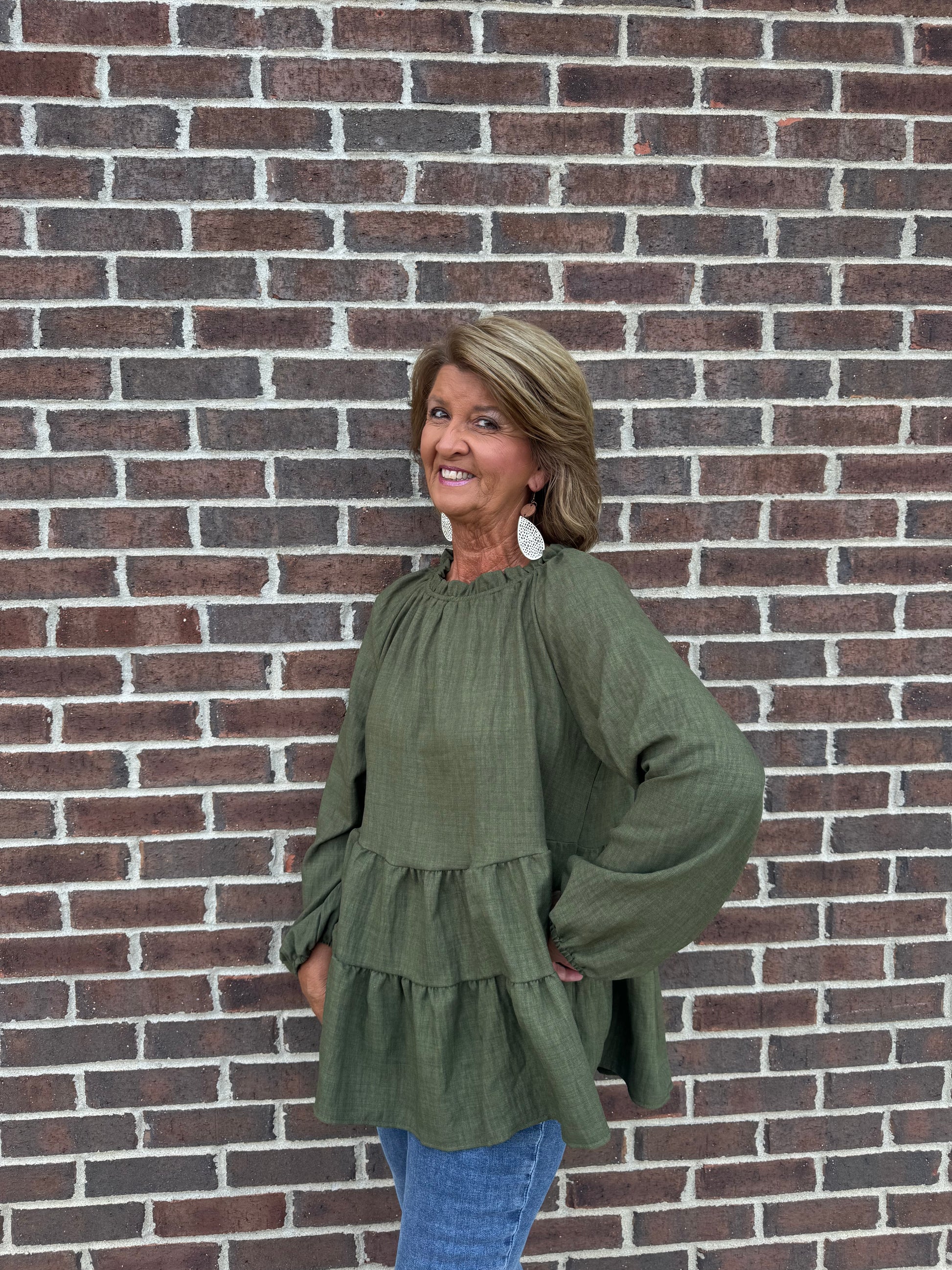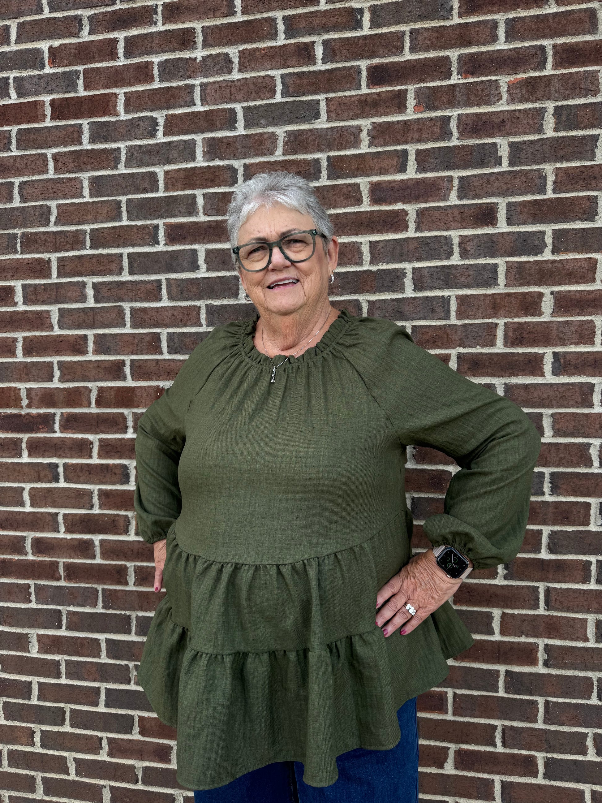 Carole Christian Long Sleeve Tiered Top with Ruffle Neckline - Olive
