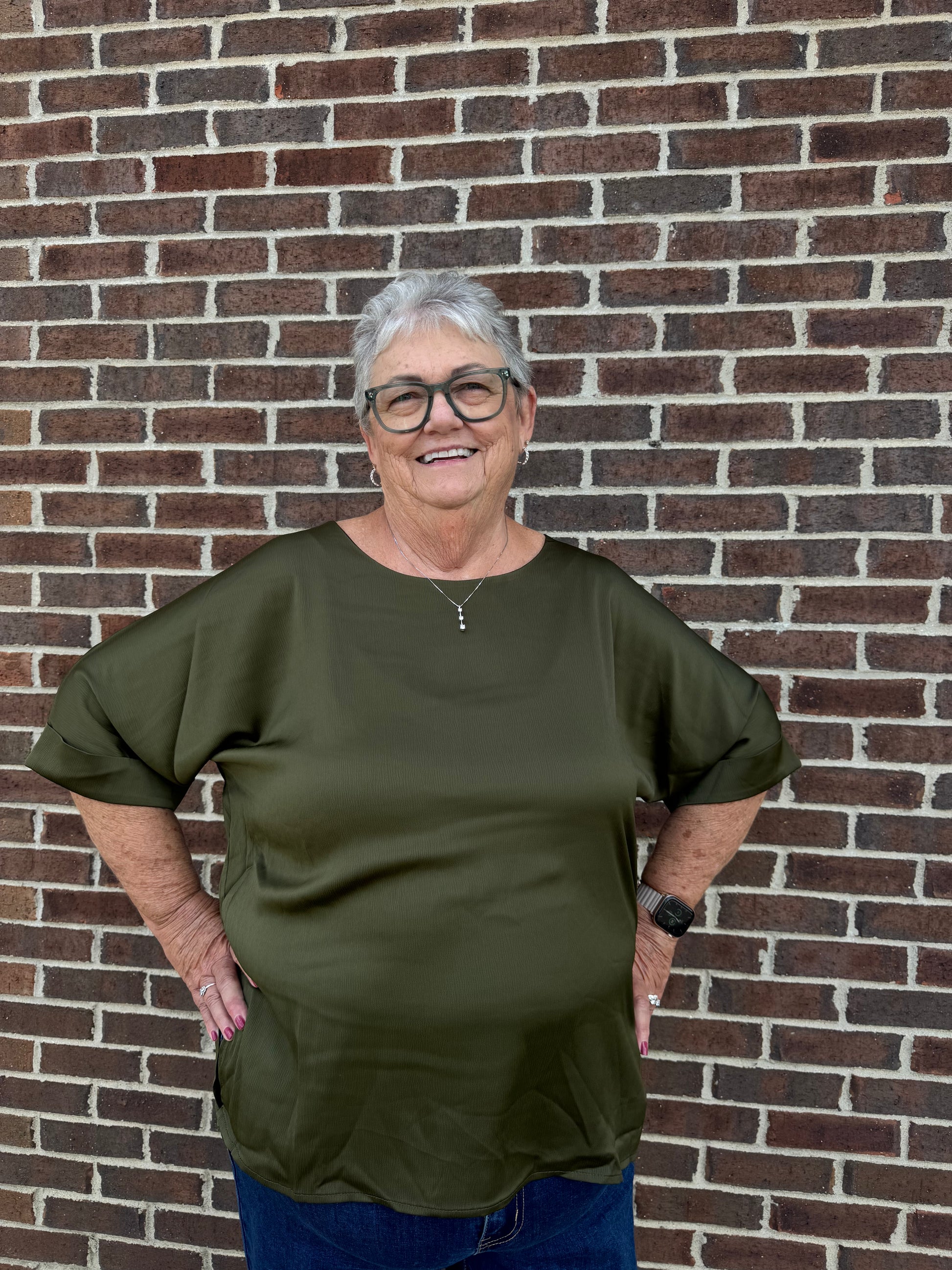 Carole Christian Split Hem Round Neck Top with Cuffed Sleeves - Olive