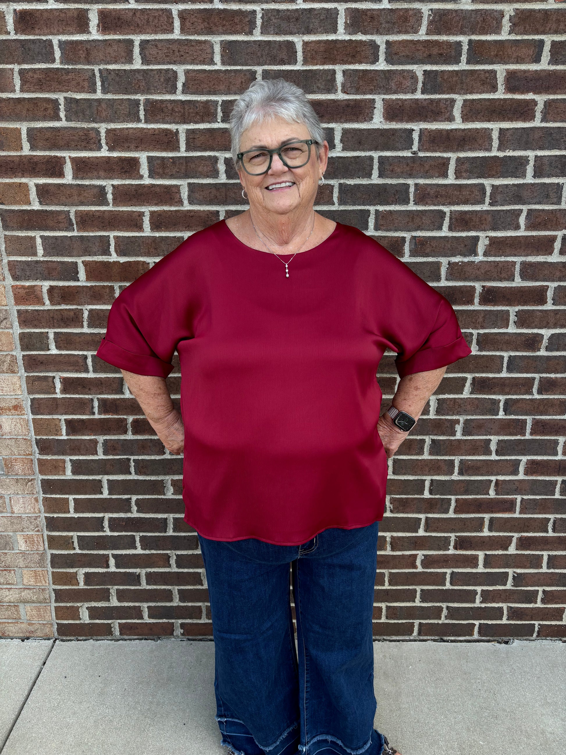 Carole Christian Split Hem Round Neck Top with Cuffed Sleeves - Burgundy