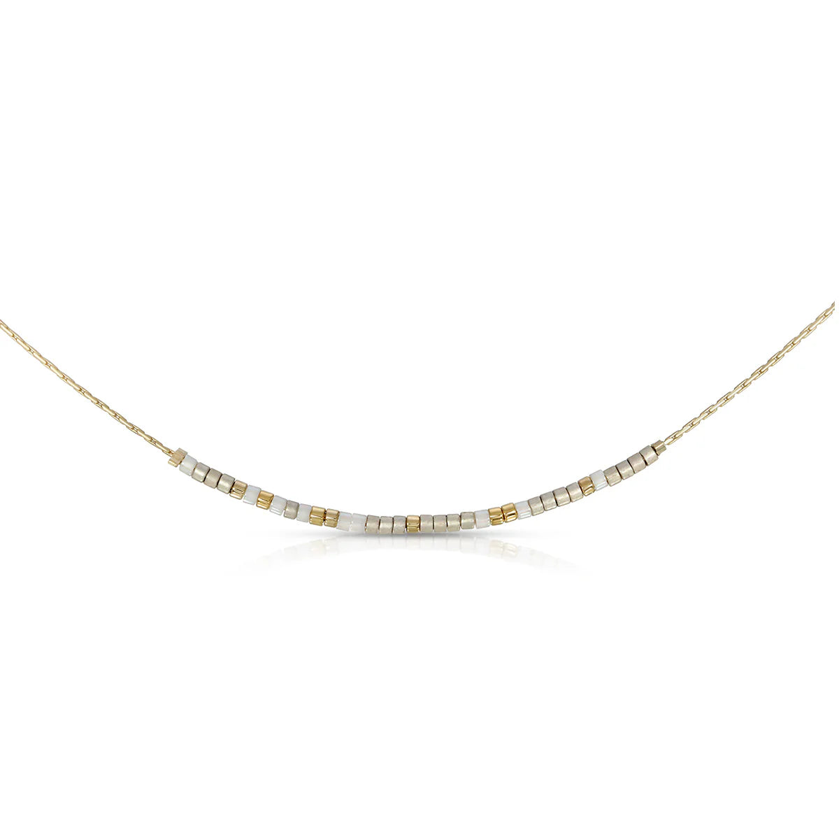 This message is encoded using pearly white and pewter gray glass beads in a neutral design.