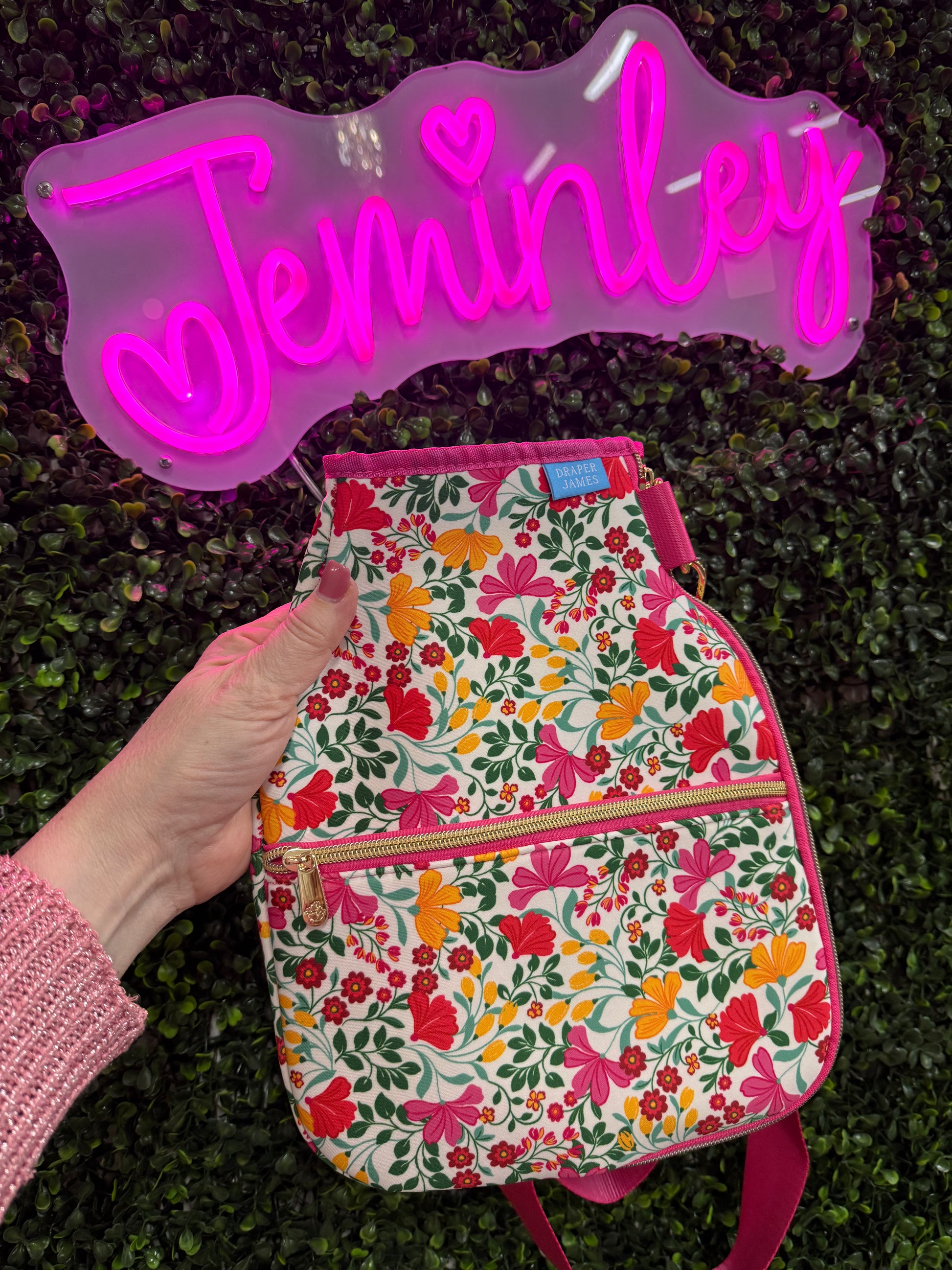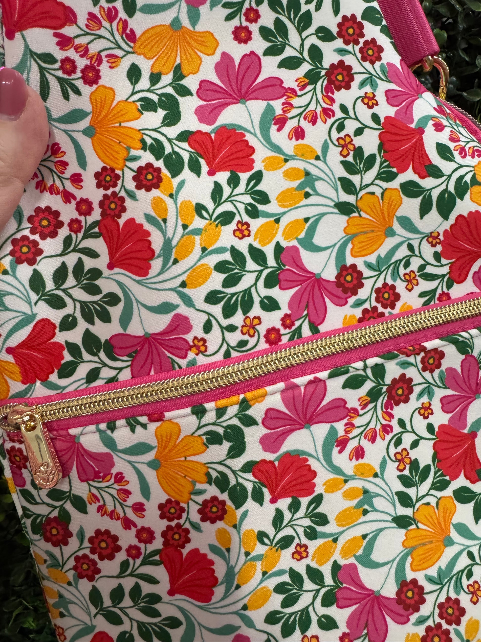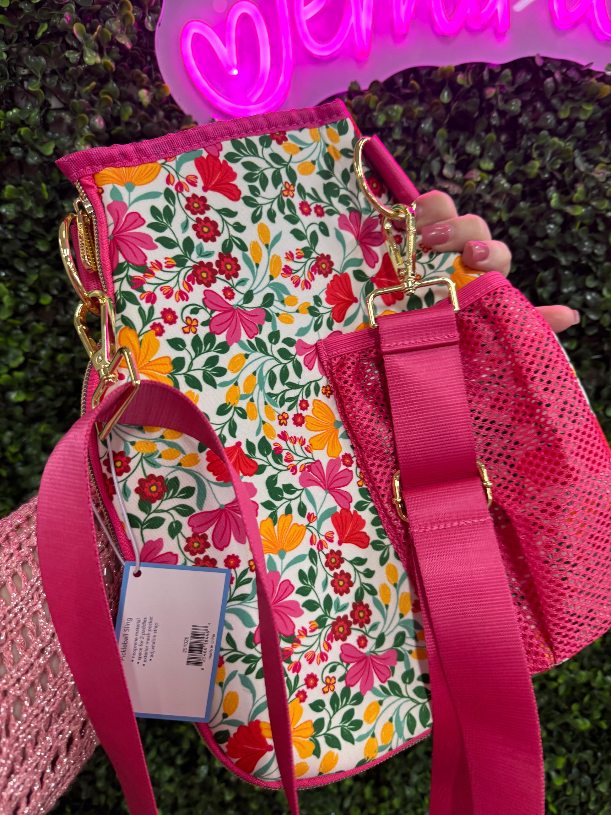 This Pickleball sling is in the coneflower pink pattern with neoprene material. It has space for two paddles. The exterior has a mesh pocket and adjustable strap.
