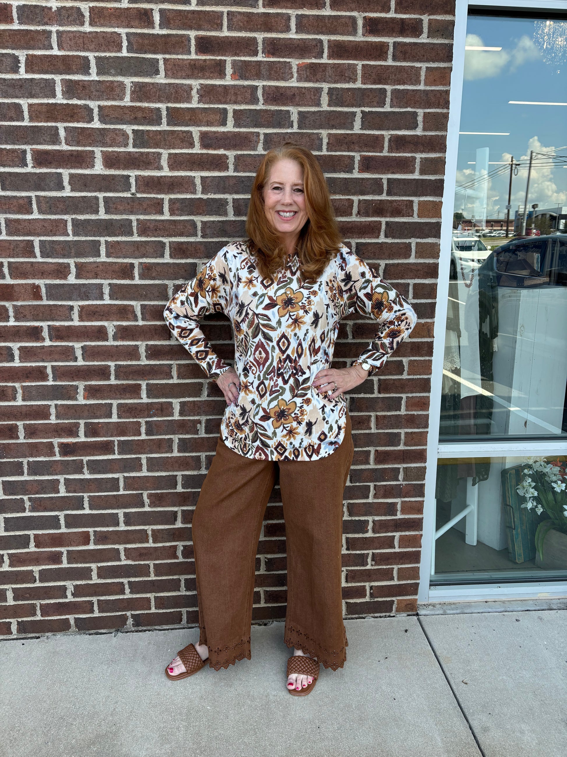 High waist ankle length pants featuring floral embroidered border hem. Classic button fly-front zipper closure. Classic jean pockets. Unlined. Woven. Non-sheer. Lightweight.