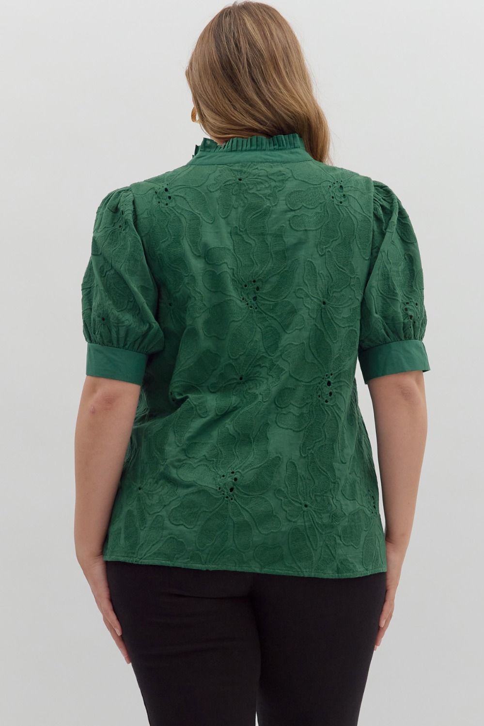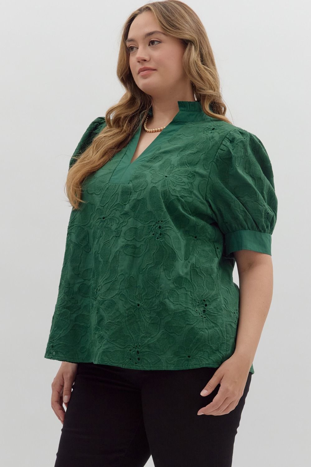 Floral embroidered short puff sleeve pullover top featuring pleated band collar split V-neck. Lined. Woven. Non-sheer. Lightweight.