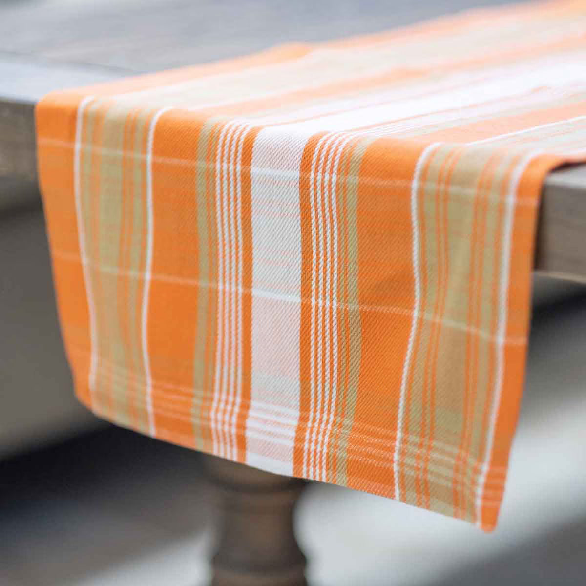 Orange and neutral toned plaid runner measuring 90 inches in length and 13 inches in width.