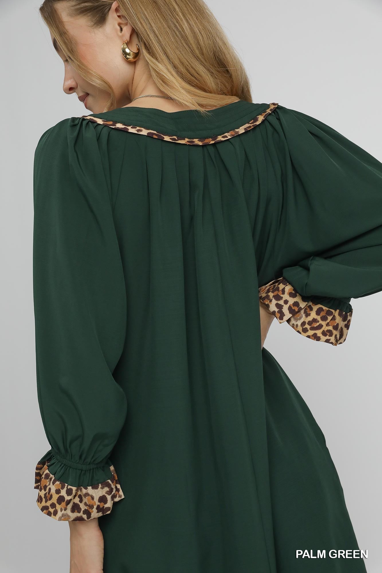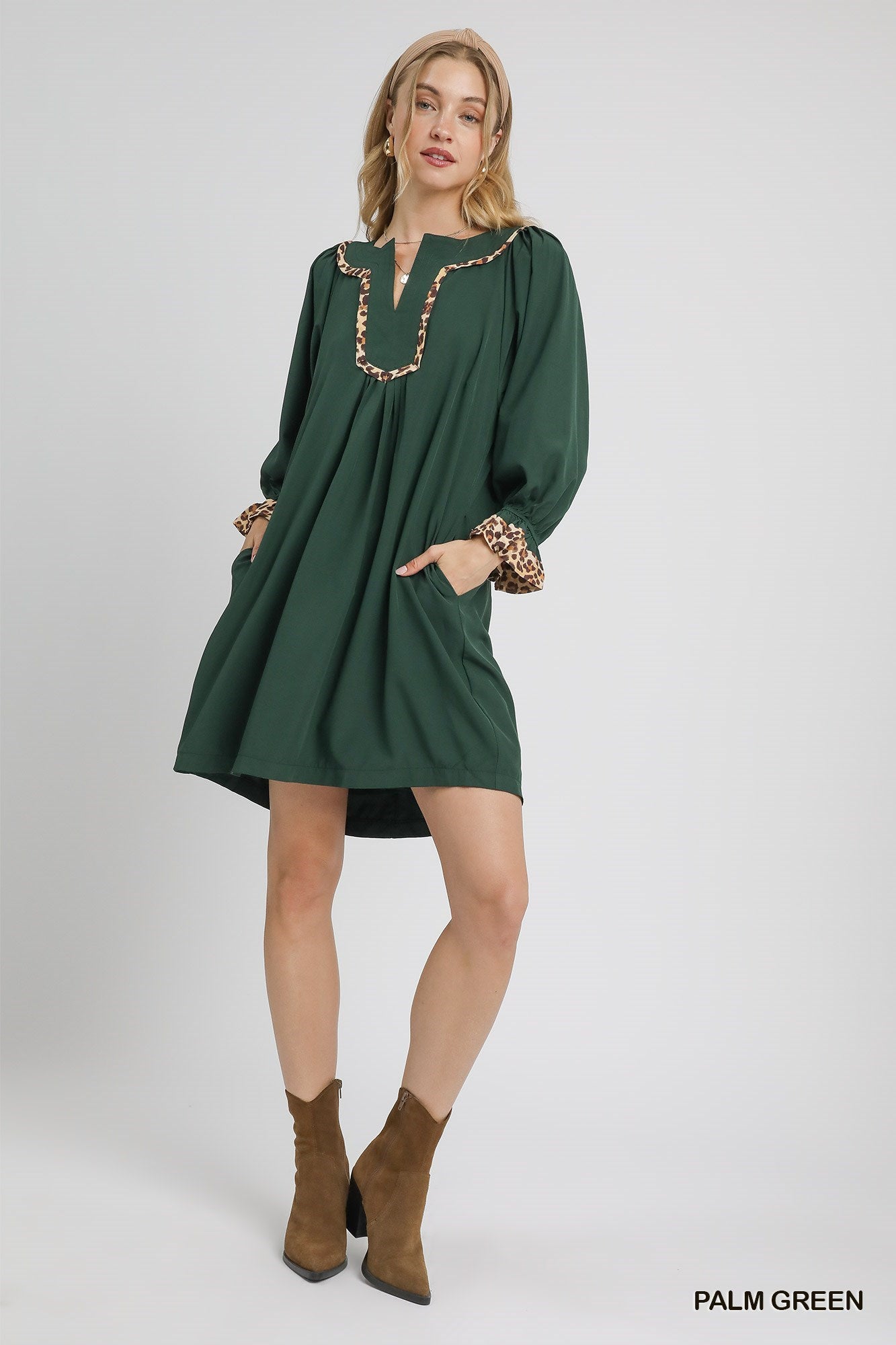 Umgee Tunic Dress with Leopard Trim Accents - green