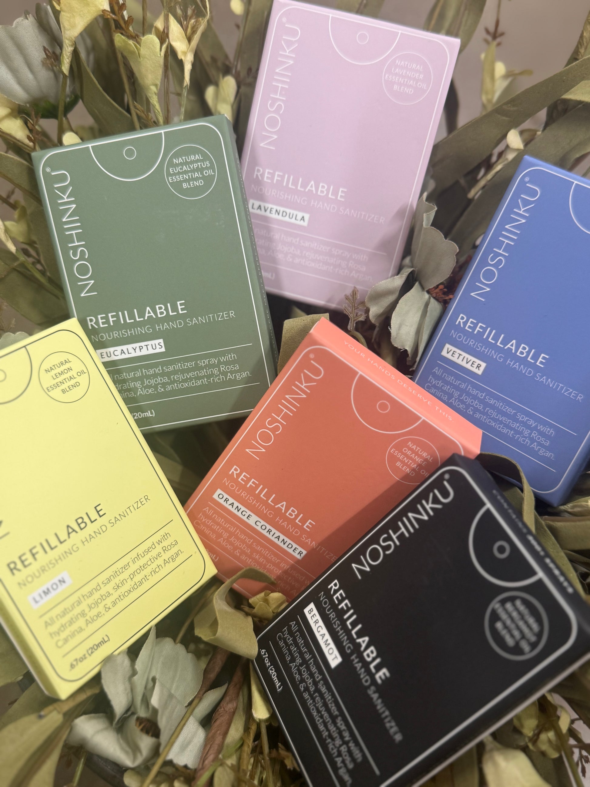 NOSHINKU’s refillable hand sanitizer is created with all natural ingredients! It has hydrating Jojoba, skin-protective Rosa Canina, Aloe, & antioxidant-rich Argan to keep your hands nourished, moisturized, and sanitized!